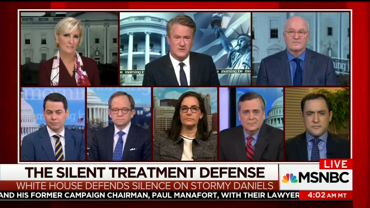 Throughout the three-hour show, panelists described the President as “silent,” “frozen,” and “hiding.” Brzezinski was particularly keen to discuss the Daniels issue, even opening the show by vowing, “Despite that quick shift in the news cycle, Stormy Daniels isn’t going away.”