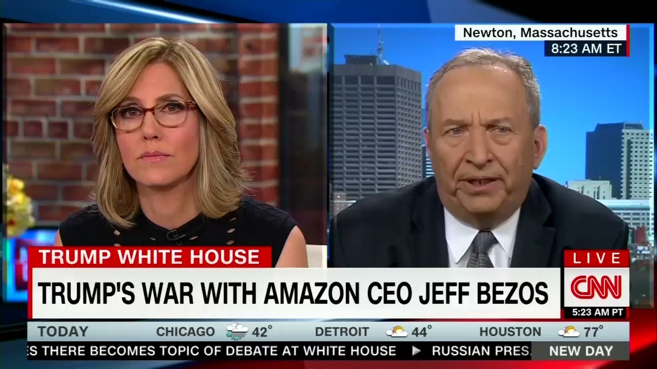 During an appearance on CNN’s New Day Thursday, former United States Treasury Secretary Larry Summers weighed in on President Trump’s recent tweets attacking Amazon and Jeff Bezos. Summers painted the President’s tweets as “going on jihads with the power of the Federal government against companies whose CEO’s private activity he doesn’t find congenial,” in addition to comparing the President to Italian dictator Benito Mussolini.