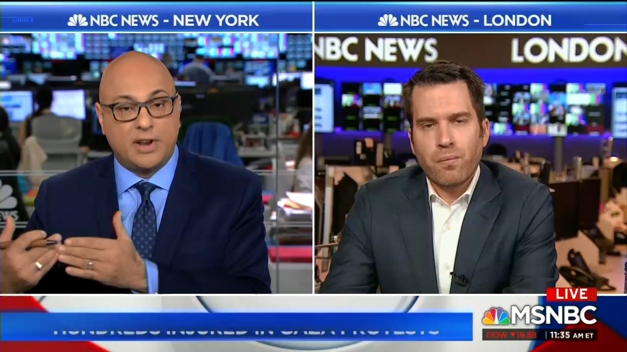 Velshi introduced the segment at 11:35 a.m. Eastern by noting how many on the Palestinian Arab side of the border have been killed and injured. He then referred to "refugees" who were "forcibly removed" from their homes in Israel without noting that the expulsions and evacuations happened 70 years ago, and that over 99 percent of those Arabs who are categorized as "refugees" are their descendants and have never even been to Israel.