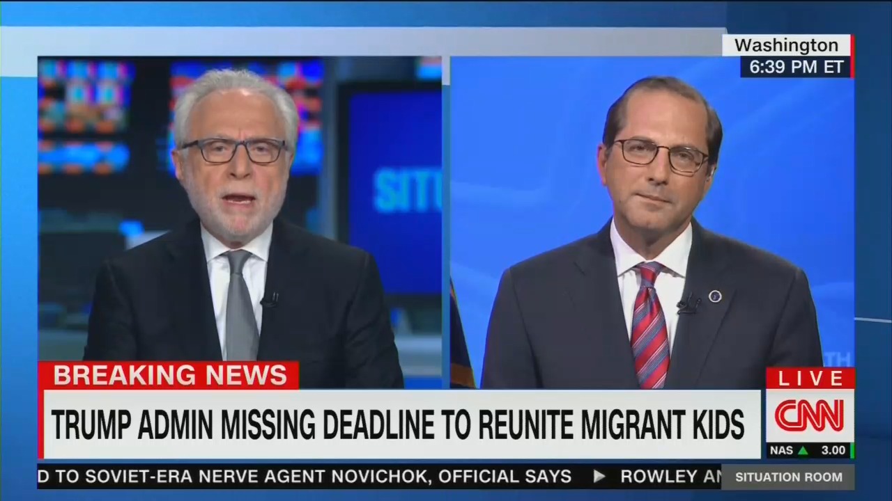 In his Tuesday evening appearance on CNN's The Situation Room, Azar recalled that a portion of the 102 children under five in the care of HHS were found to be with parents who either were not the real parents, or who had criminal records or had abused the children. But host Blitzer seemed oblivious to the value of taking the time to scrutinize immigrants who drag children across the border illegally as he repeatedly complained about it taking so long to return many of the children to their parents.