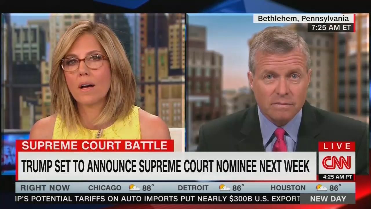 Before a commercial break at 6:16 a.m. Eastern, co-host John Berman brought up Senator Collins in a plug: "Susan Collins says abortion will be a key. She thinks Neil Gorsuch would not vote to overturn Roe versus Wade. Is Susan Collins living in a fantasy world?"