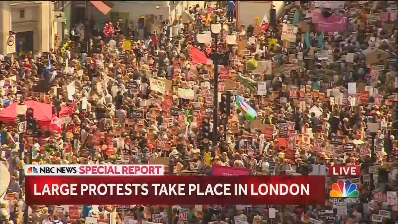RICHARD ENGEL: So, while you just heard President Trump stop any criticism on him as fake news, he can't dismiss this as fake news. These are real protesters. There are tens of thousands of people in the streets. These are the biggest demonstrations London has seen in years and they’re from many different communities. People are here, young, old, ethnically diverse, LGBTQ and they are all here to say that President Trump is not welcome in this country. There are now just starting to march. The delay — the protest in this march is somewhat delayed because the crowds have been so big. There's also a lot of anger here that they say President Trump is trying to interfere in British politics, embarrassing the British government, bullying the British government. So while he says that the problem in the most special relationship between the United States and the U.K, it is a very different feeling here on the streets of London, where we’re seeing the biggest protests against the U.S. President — biggest protests in this city in years.