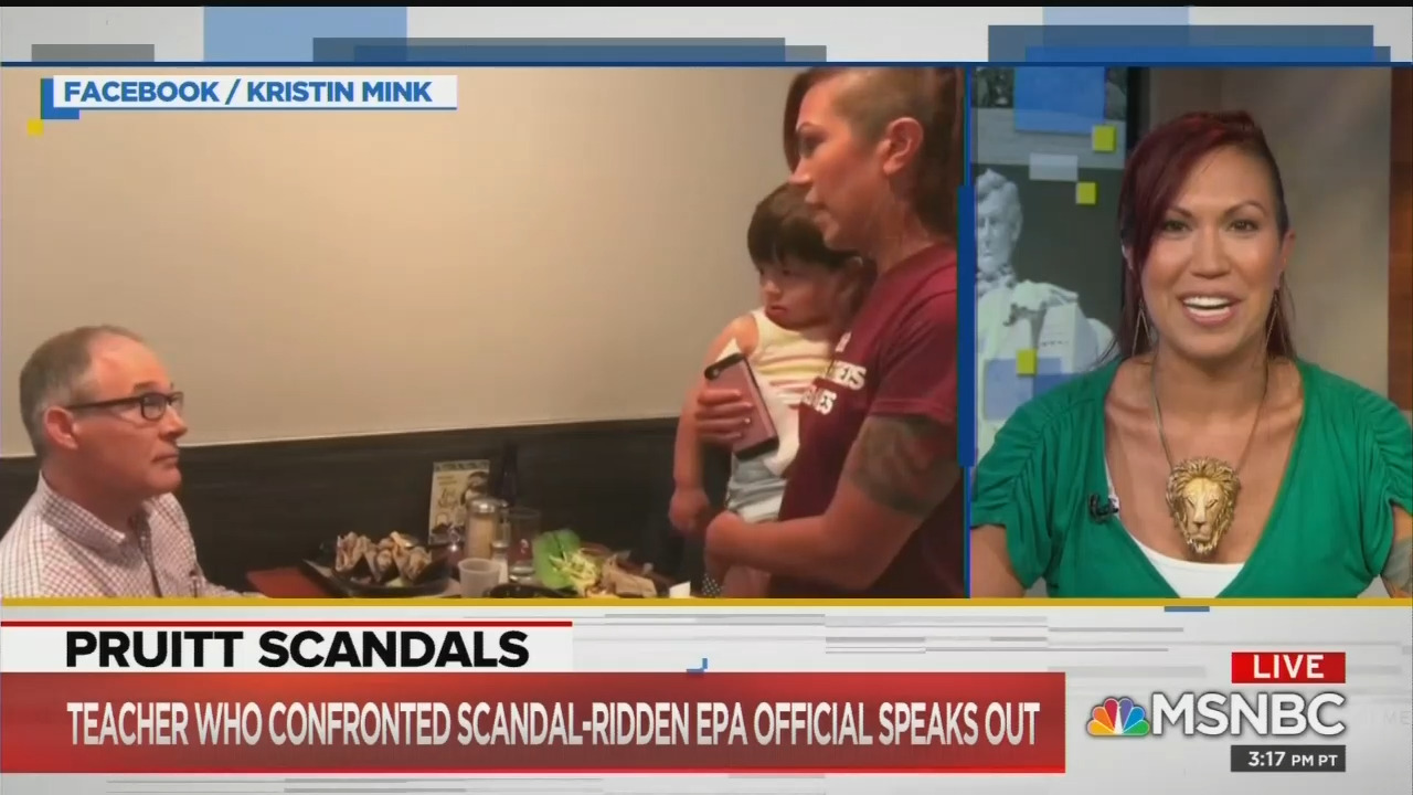 During Tuesday’s edition of The Beat With Ari Melber and less than 24 hours before EPA administrator Scott Pruitt resigned, guest host Ayman Mohyeldin interviewed Kristin Mink, the teacher who confronted Pruitt at a Washington D.C. restaurant.