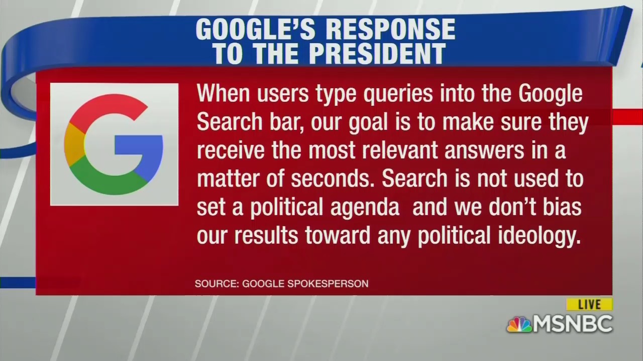 On Tuesday’s Hardball, an MSNBC panel addressed the growing concerns about social media platforms censoring conservatives, after President Trump accused Google on Twitter and yesterday in a pool press spray, of filtering results against him and of Facebook and Twitter censoring conservatives.