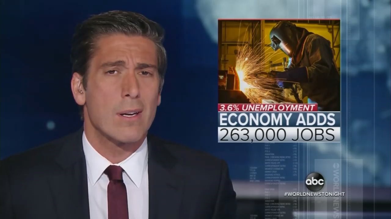 The news was shocking on Friday morning when the Labor Department reported the economy added 263,000 new jobs -- higher than expected -- lowering the unemployment rate to 3.6 percent, the lowest in fifty years. Would the networks acknowledge this news, or try to dodge it like last Friday's surprisingly strong 3.2 percent growth in GDP? ABC and CBS skipped that, and NBC gave it ten seconds. This Friday, Curtis Houck noted on Twitter that CBS and NBC had full reports on Friday night, but ABC's World News Tonight was done with it in 18 seconds.