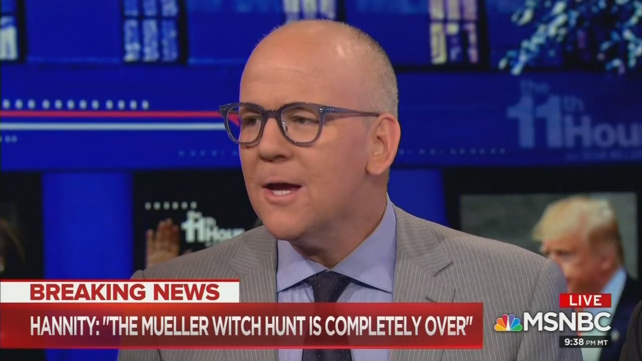 On Wednesday's The 11th Hour with Brian Williams on MSNBC, during a discussion of Fox News reaction to Attorney General Bill Barr's testimony on the Mueller report, John Heilemann derided FNC host Sean Hannity as a "steaming, hot pile of Hannity" who is as "happy as a pig in ****" as the MSNBC national affairs analyst seemed annoyed at having to react to the conservative Fox News host's commentary.