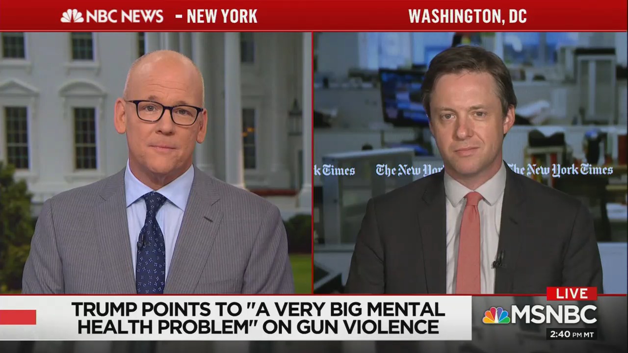JOHN HEILEMANN: Joining us now New York Times White House correspondent Michael Crowley. Michael, I ask you given this display of craven backsliding, hypocrisy, self-contradictions and mealy-mouthed talk coming out of President Trump over the course of the last week in this topic, are we exactly where the most cynical people assumed we would be as soon as El Paso and Dayton happened, which is to say nothing gonna’ happen, Trump not gonna’ help, nothing going to change