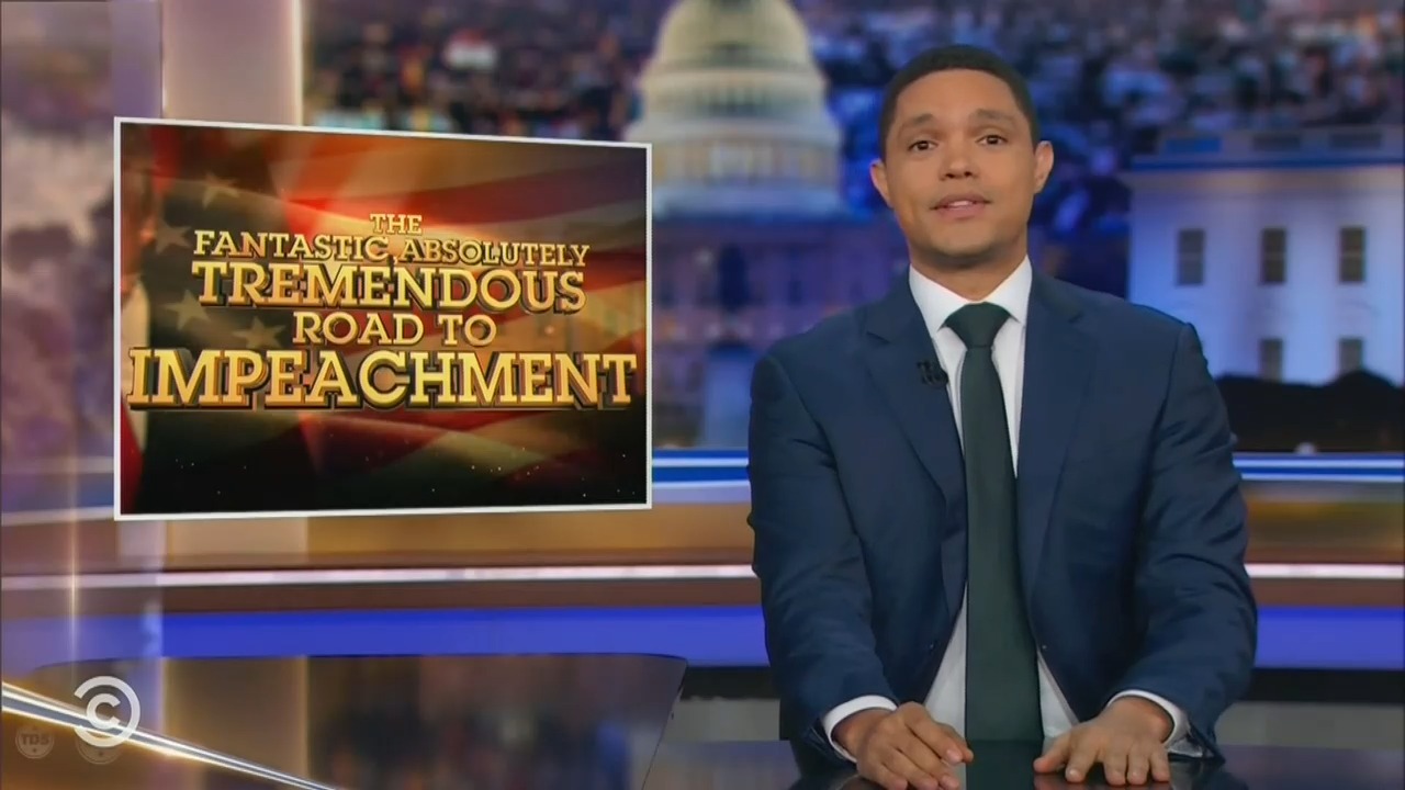 TREVOR NOAH: Impeachment. It's the Constitutional way to swipe left on a President. After a whistle-blower accused President Trump of using his office to pressure the President of Ukraine to investigate Joe Biden. Nancy Pelosi, Speaker of the House and woman who hasn't blinked since y2k, responded yesterday by launching an official Impeachment investigation. And as you can imagine, since then things have only escalated. So let's catch up on all the latest developments in our ongoing segment, the fantastic, absolutely tremendous road to impeachment. When he left off last night the Democratic announcement of an Impeachment Inquiry had Trump up against the ropes. And so in response, Trump said that he would release a transcript of the phone call he had with Ukraine's president and Trump claimed this transcript would prove that he is so innocent, the most innocent person. But now we have all seen the transcript and I'm starting to wonder if Trump even read it. Yes, the transcript of the call is out. And not only did Trump definitely ask the President of the Ukraine to work with his personal lawyer, slash vampire henchman, to investigate Joe Biden, he also tried to rope in the United States Attorney General. And if that happened, that is a big deal. Because a president can't go around using the Justice Department as his personal task rabbit, that is not allowed. It is the same way an employee at Domino's would get into trouble for drying his laundry in the pizza oven, okay. You can do it but don't be shocked when Domino's impeaches your ass. And you might be wondering, if this phone call is so damning why did Trump even release the transcript? Only an idiot would do that, exactly. And also, and also-- This is what Trump does. He does this all the time. Like Trump is the only person who would do something so bad right out in the open that it makes you question whether it is actually bad.