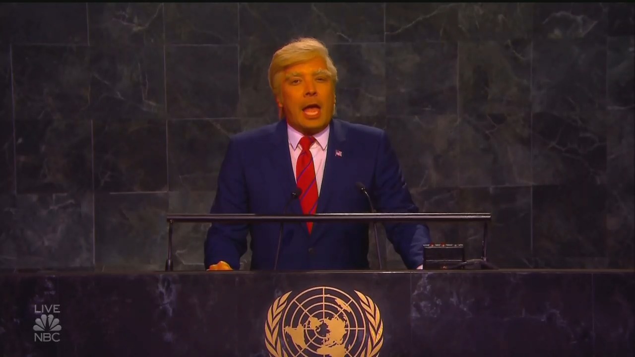 JIMMY FALLON: Thank me. Thank me very much. You're all very happy that I'm here at the United Nations. And then wow, just look at all the room full of diverse cultures and ethnicities seriously, it's like the scariest college brochure I've ever seen. But I know what you're all thinking, it's so great to be here with me for the last four to six hours of my Presidency. Who knew? You make one phone call blackmailing a foreign leader and everyone acts like you made one phone call blackmailing a foreign leader. I guess it's like the old saying, fool me once shame on you. collude twice, why not collude a third time? But now, it looks like my whistle has been blown and not in a good way. It was a lowdown blowdown. And now I have to face off against America's least fun grandma, Nancy Pelosi.
