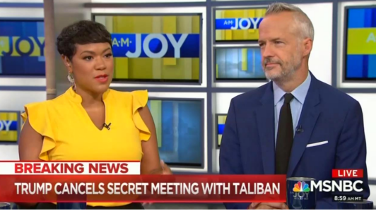 On Sunday's AM Joy, she received support from MSNBC regular Tiffany Cross, managing editor of The Beat DC website. As we learned President Trump had canceled plans to welcome the Afghan president and Taliban representatives to Camp David, Cross wise-cracked that “maybe Donald Trump is the secret Muslim President that they feared Barack Obama was.”