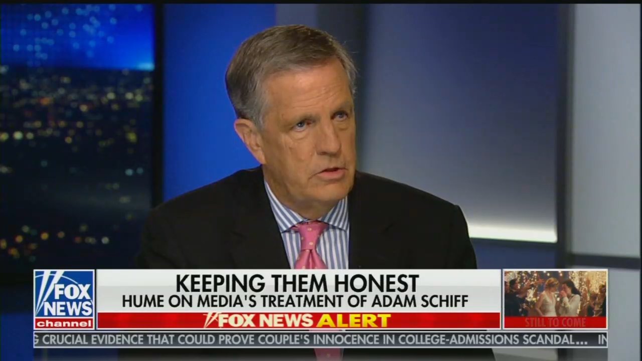 John Sexton at Hot Air pointed out that Fox's Brit Hume ripped into the media on Monday's Fox News at Night for its willingness to promote Adam Schiff no matter how preposterous his statements are. "One of the wonders, to me, of modern media is the failure of my colleagues in this business to see through this guy Schiff."
