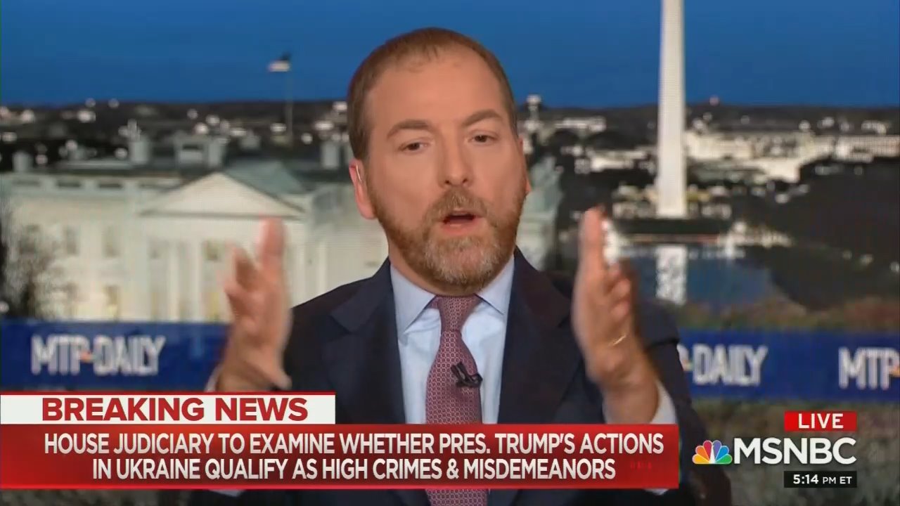 As the panel on Tuesday’s MTP Daily reacted to the release of the House Intelligence Committee’s impeachment report, host Chuck Todd repeatedly griped that the Democrats have not pushed hard enough as they seek to move public opinion regarding the impeachment inquiry. Throughout the entire segment, Todd acted as if he still served in his old role as a staffer on Democrat Tom Harkin’s 1992 presidential campaign and not in his new role as an objective journalist.