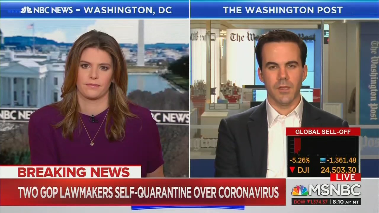 Washington Post reporter (and PBS Washington Week host) Robert Costa joined MSNBC Live guest host Kasie Hunt on Monday to talk about the coronavirus. After mentioning that two Republican members of Congress, Sen. Ted Cruz and Rep. Paul Gosar are self-quarantining out of an abundance of caution after someone at CPAC tested positive for the virus. Costa claimed that only now are conservatives taking the threat of COVID-19 seriously.