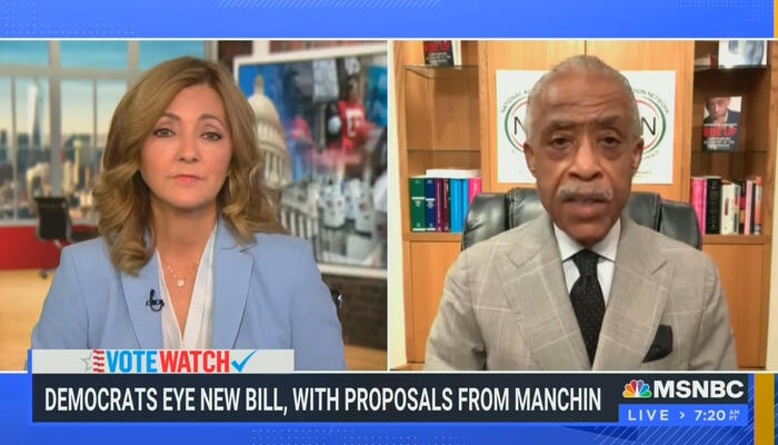 “Right now on Capitol Hill, Democrats are getting ready to go public with a new version of a voting rights bill,” Jansing announced while filling in for Hallie Jackson in the 10:00 a.m. ET hour, desperately trying to keep hope alive for bill that had no chance of passing. The host gushed: “Among those working on it, Majority Leader Chuck Schumer, Senator Raphael Warnock, and Senator Joe Manchin....As civil rights leaders keep the pressure for action on, including in more behind the scenes talks with Manchin...”