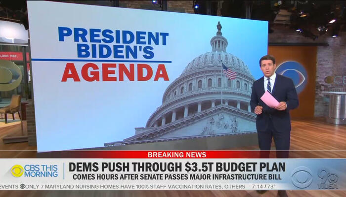 TONY DOKOUPIL: Breaking overnight, hours after passing a major infrastructure bill with bipartisan support, the Senate took another big step to push through President Biden’s agenda. It narrowly approved a $3.5 trillion blueprint for family, health, and environmental programs. Much of that would be paid for with higher taxes on wealthy Americans and corporations. Kris Van Cleave is on Capitol Hill for us. Kris, good morning to you. What's next?